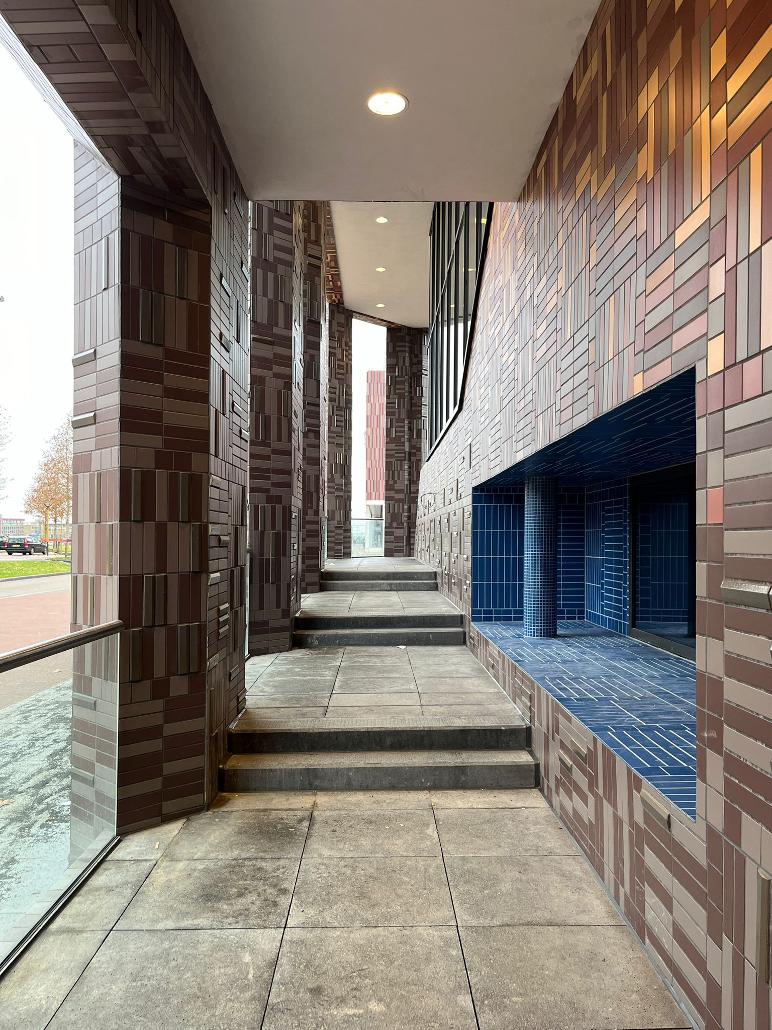 Het gehele schoolcomplex staat als een huis aan het Berlijnplein van VINEX-wijk Leidsche Rijn, met gevels in een mozaïek van keramische tegels, onderbroken door rechthoekige erkerramen die in het gevelvlak zijn teruggelegd. Op de hoek van het plein ontvouwt de gevel zich tot een twee bouwlagen hoog portaal dat ruimte biedt aan het hoofdentreegebied met zitbanken tussen de ‘pilaren’ en een vorstelijke luie trap met tussenplateaus die oploopt naar de volledig beglaasde entreepui van de ontvangstruimte op de eerste verdieping.