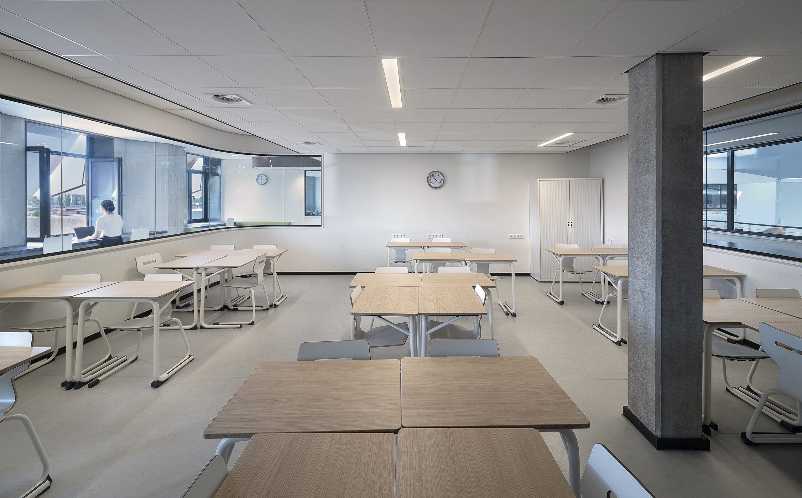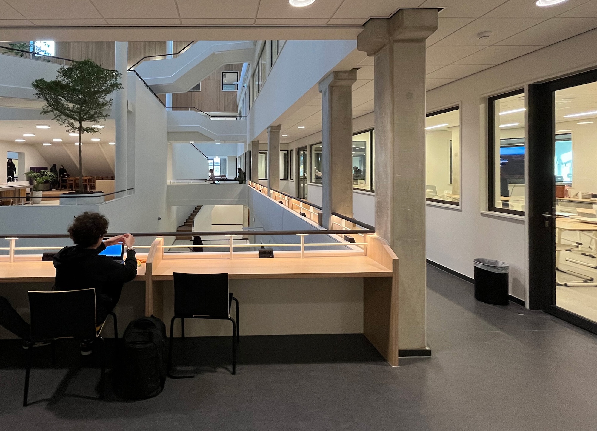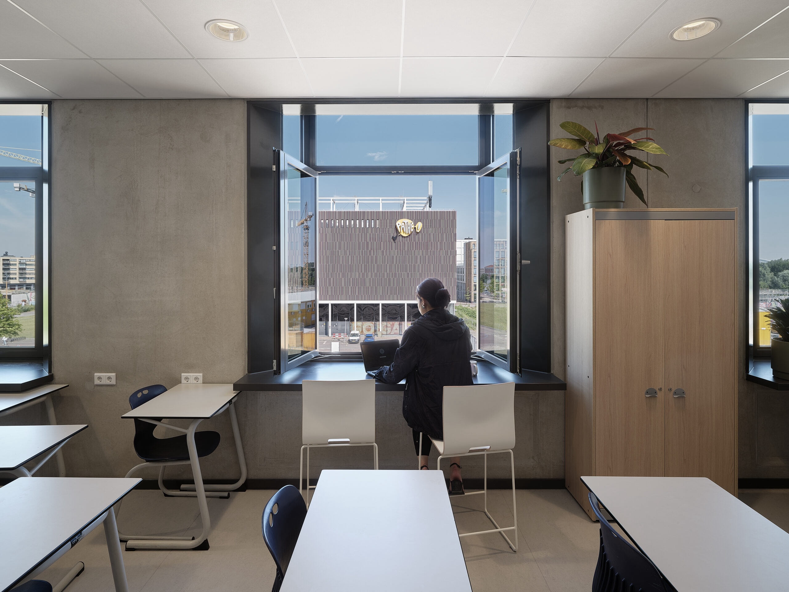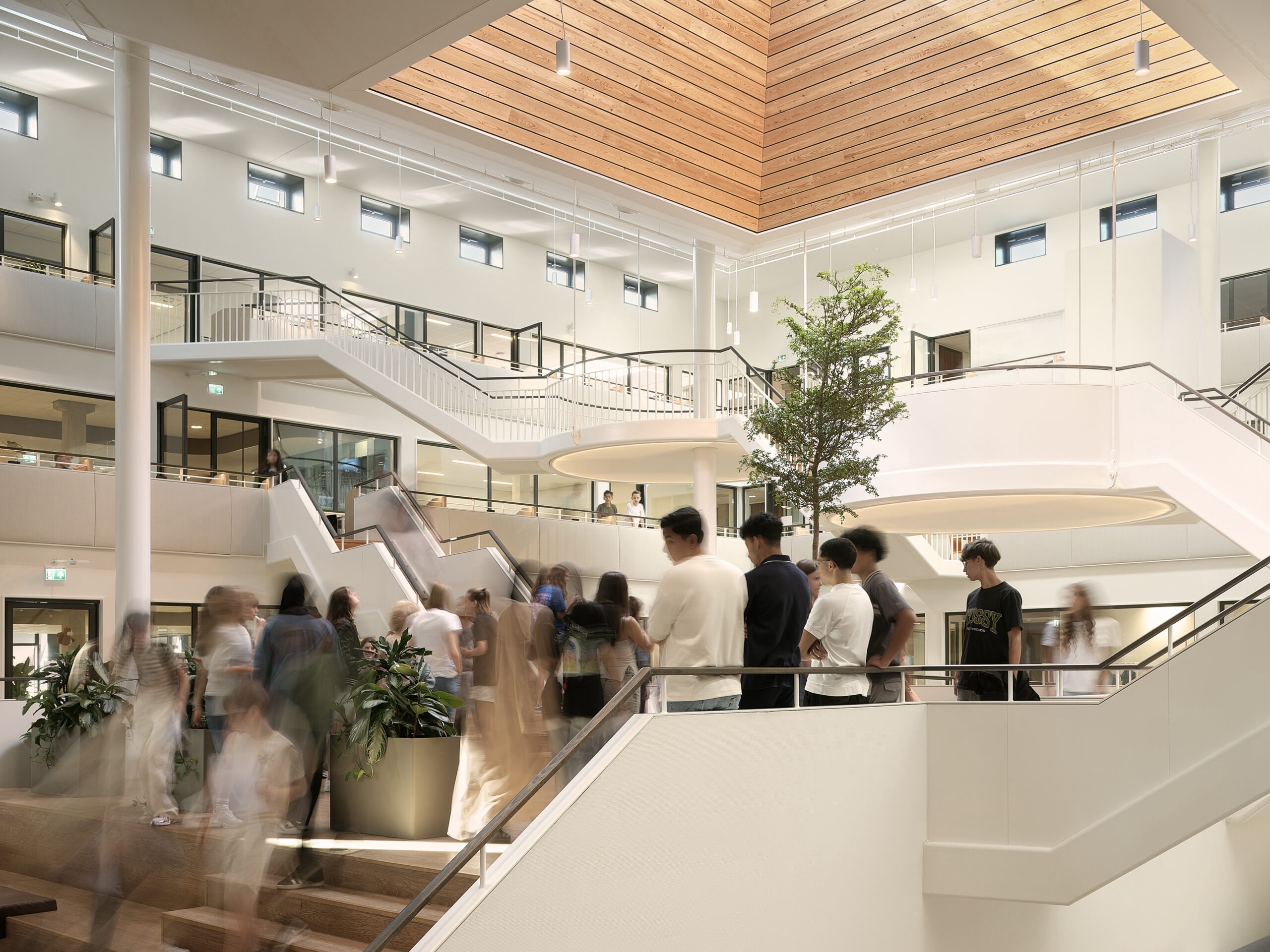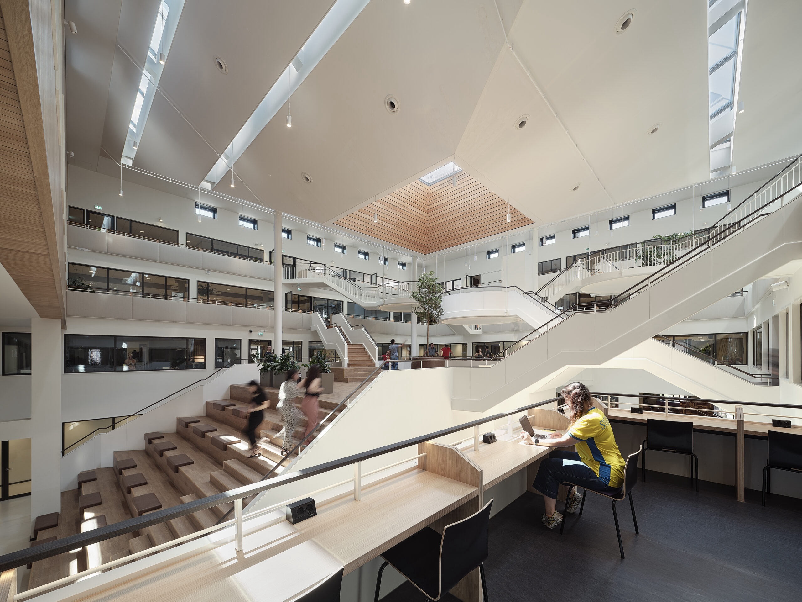 Het nieuwe zeslaagse schoolgebouw is dan ook opgedeeld in acht ‘thuisunits’: kleinschalige domeinen voor groepen van maximaal 180 leerlingen met een variatie aan leer- en werkplekken. De units liggen rondom het centrale atrium, elk met een eigen toegang. Een deel van de werkplekken is geplaatst aan de balkonranden, met uitzicht en overzicht over het ruimtelijke, gebouwhoge atrium en de andere thuisunits. Zo voelt iedereen zich, op welke verdieping dan ook, thuis binnen het toch behoorlijk omvangrijke schoolgebouw. De klaslokalen voor ongestoord lesgeven en leren zijn in een iets meer gesloten strook langs de gebouwgevel gepositioneerd.