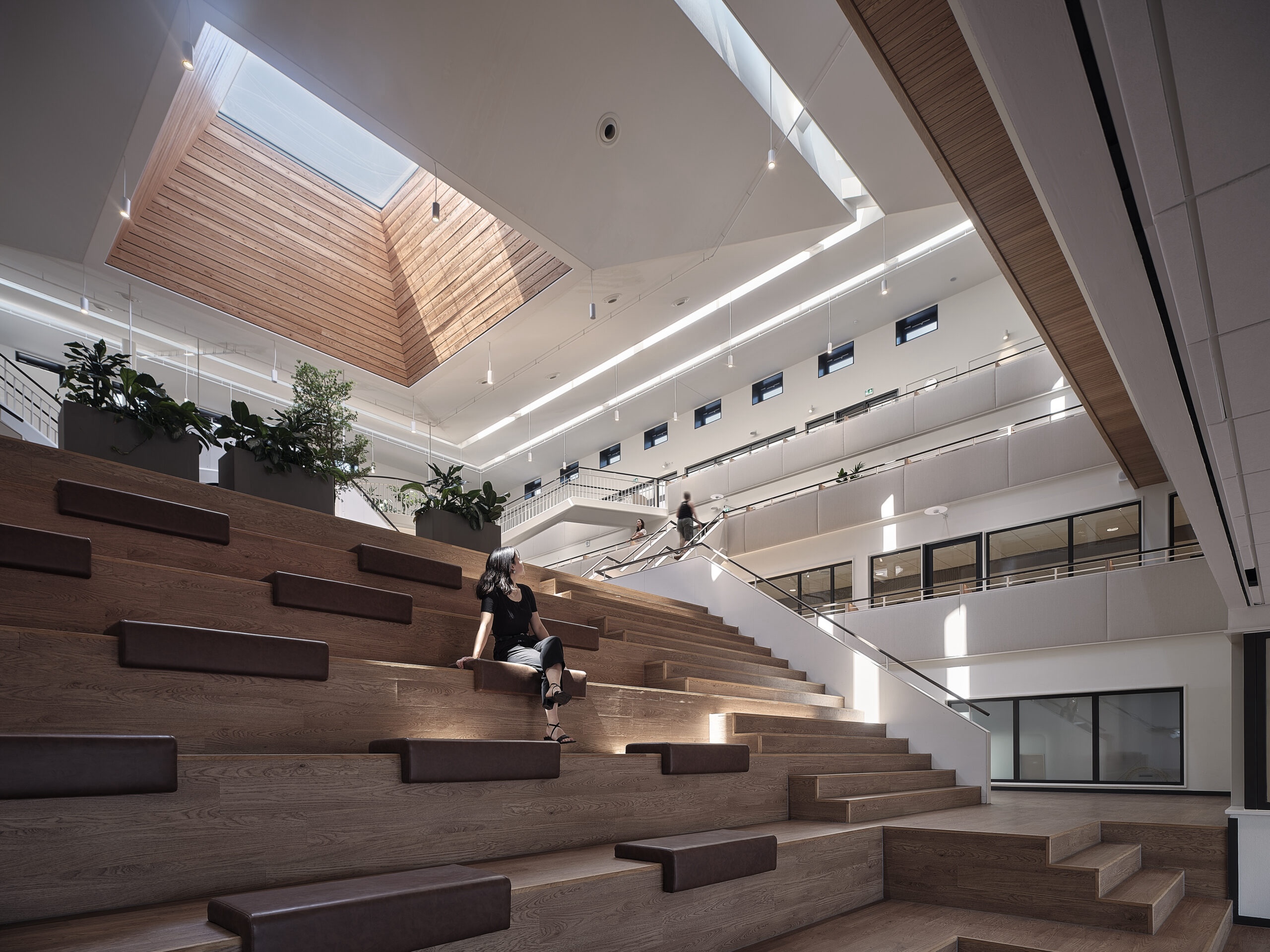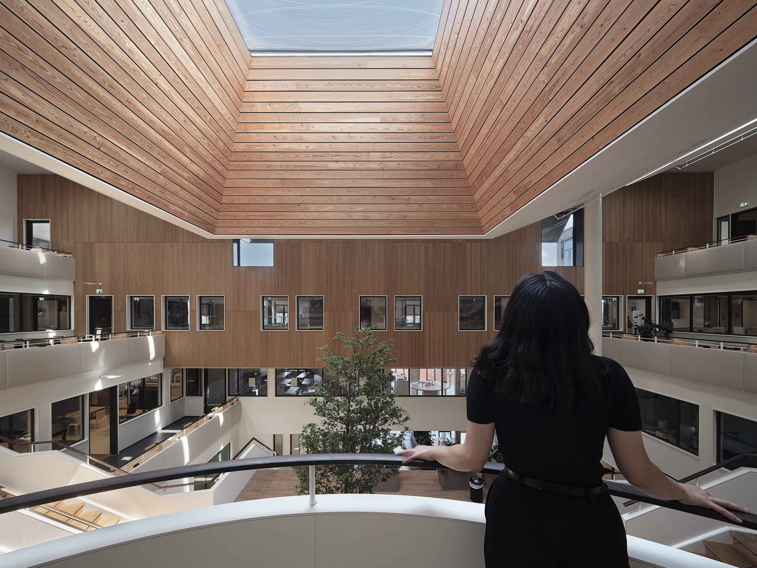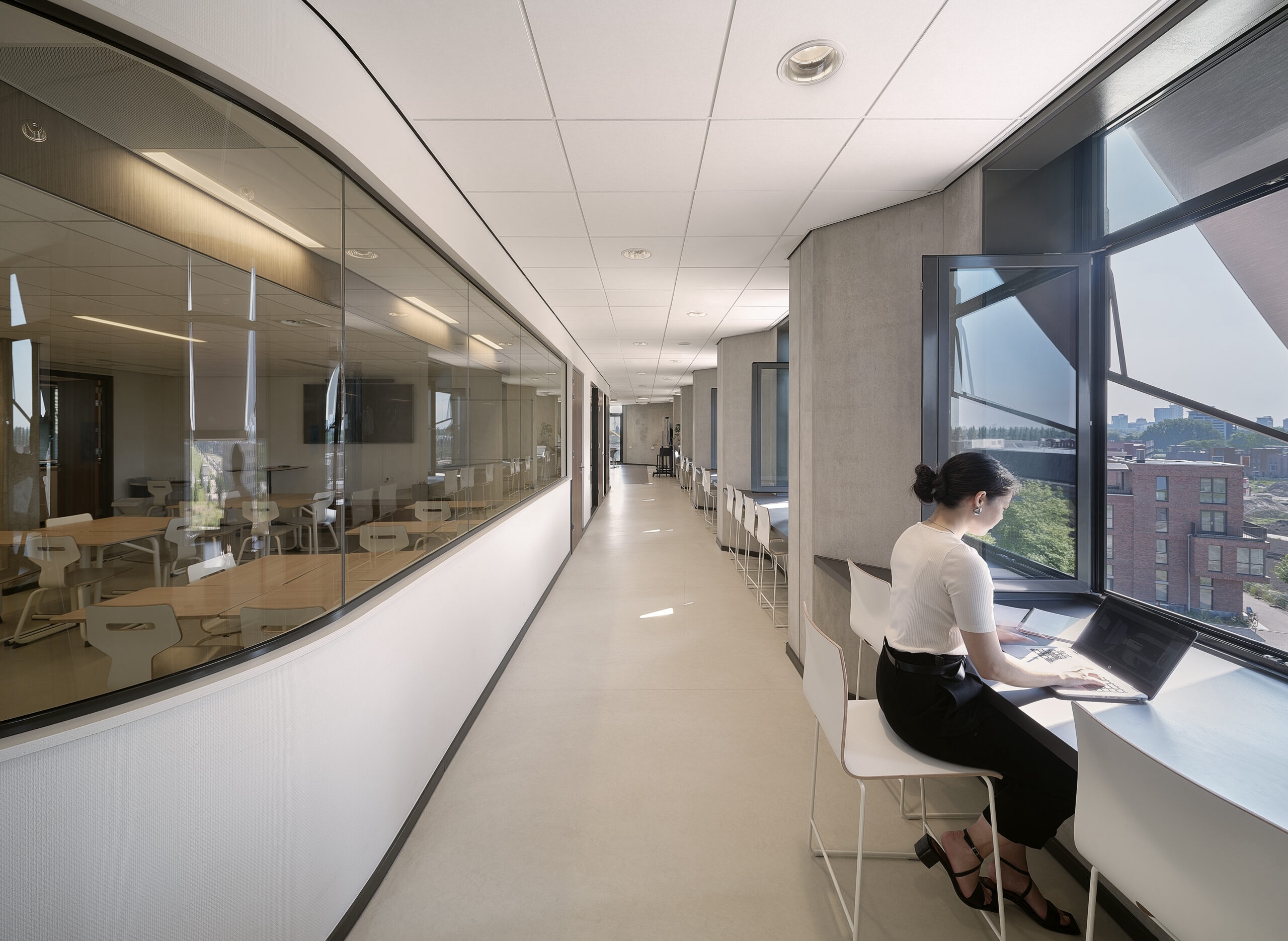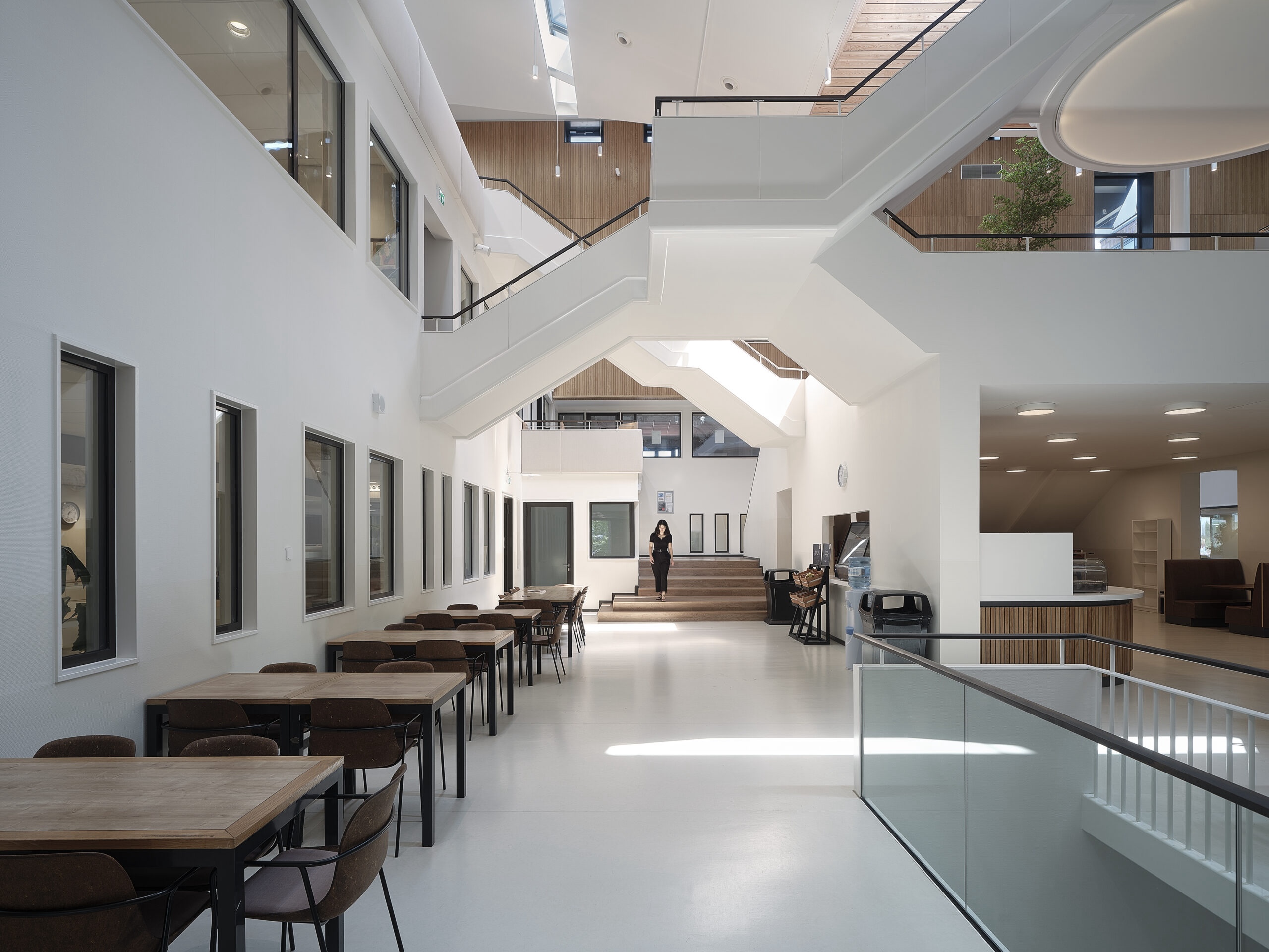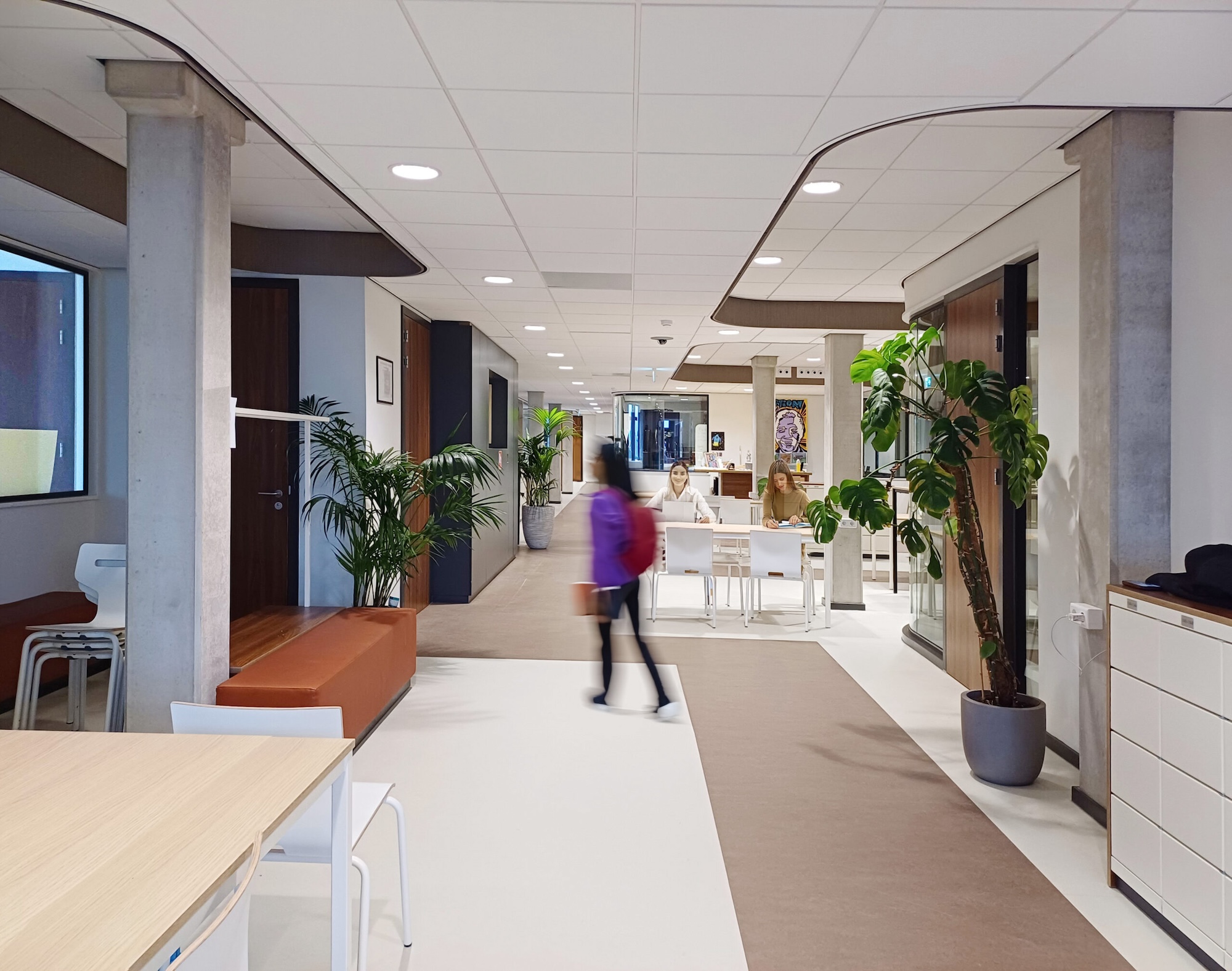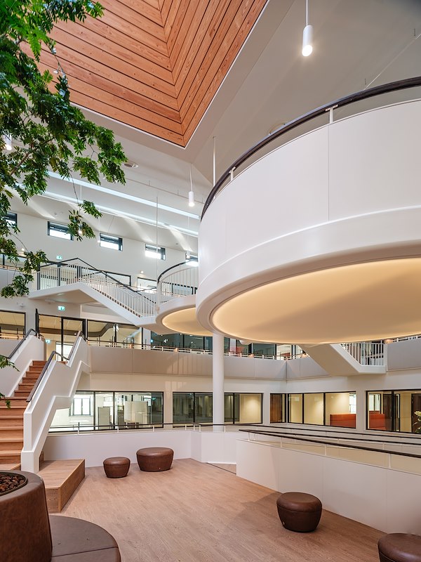 Het nieuwe zeslaagse schoolgebouw is dan ook opgedeeld in acht ‘thuisunits’: kleinschalige domeinen voor groepen van maximaal 180 leerlingen met een variatie aan leer- en werkplekken. De units liggen rondom het centrale atrium, elk met een eigen toegang. Een deel van de werkplekken is geplaatst aan de balkonranden, met uitzicht en overzicht over het ruimtelijke, gebouwhoge atrium en de andere thuisunits. Zo voelt iedereen zich, op welke verdieping dan ook, thuis binnen het toch behoorlijk omvangrijke schoolgebouw. De klaslokalen voor ongestoord lesgeven en leren zijn in een iets meer gesloten strook langs de gebouwgevel gepositioneerd.