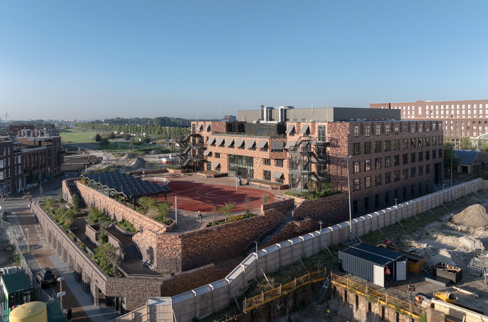 Zo’n tweederde deel van de sporthal bevindt zich onder het maaiveld. Mede hierdoor is het dak van de hal logischerwijs benut voor een verhoogd openbaar plein met veel groen en zitgelegenheid, waar leerlingen, docenten en buurtbewoners elkaar kunnen treffen en desgewenst een sprintje kunnen trekken over de 100 m lange hardloopbaan. Naast de verdiepte sporthal (en onder het atrium) zijn de gymzaal en daaronder de fietskelder ingevoegd.
