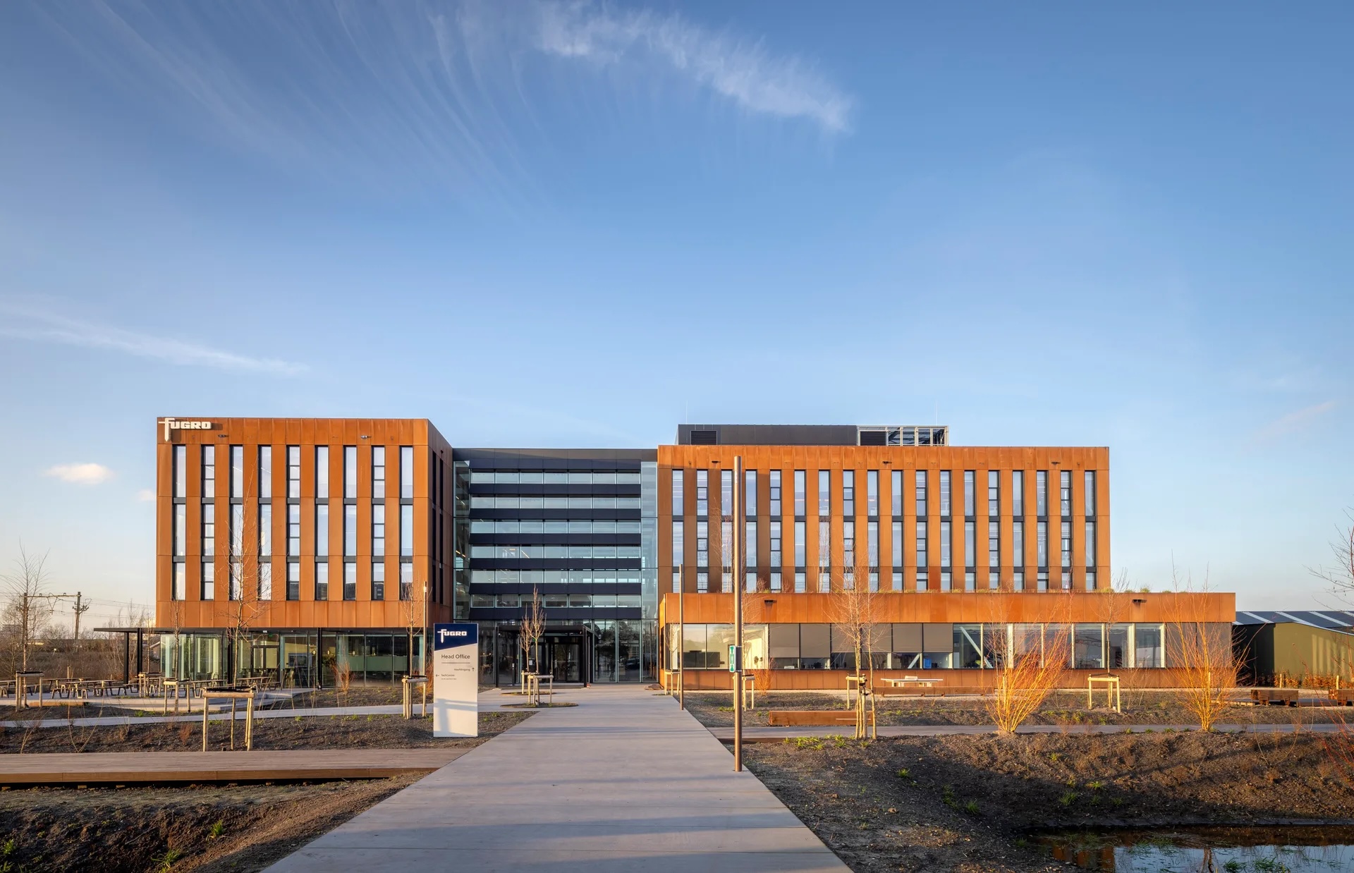 De vier gebouwvleugels van het kantoorgebouw komen bijeen op het kruispunt van twee assen. Vanuit het kantoor loopt de hoofdas, omzoomd door bomen in verzonken bakken, in één richting door naar het bestaande Fugro TechCenter. In de andere richting eindigt de as bij de nieuwe parkeergarage. Een zijpad takt aan op de naburige metrohalte. De secundaire as is ingericht met houten elementen en voorziet zo in geriefelijke ruimten voor ontmoeting en overleg.