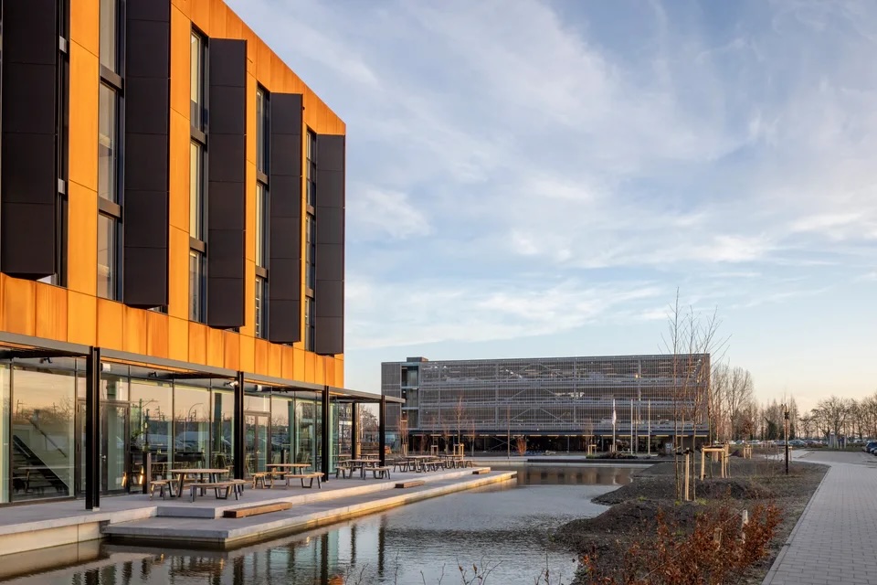 Geo-dataspecialist Fugro heeft een nieuw, internationaal hoofdkantoor op Business Park Heron in Pijnacker-Nootdorp. En niet zomaar een kantoor: flexibel, aanpasbaar, uiteraard uitnodigend, en compleet met een klimaatbestendige tuin ter versterking van de band tussen gebouw, mens en natuurlijke omgeving. De vergaande duurzaamheid van de nieuwbouw zit ‘m zeker niet in de laatste plaats in de circulariteit. Passend bij de duurzaamheidsmissie van Fugro is het gebouw volledig demontabel uitgevoerd, met herbruikbare elementen. Zowel draagconstructie als afbouw zijn – mocht ’t ooit gewenst zijn – in een handomdraai uit elkaar te halen, waarna de oorspronkelijke bouwdelen elders opnieuw als bouwdeel inzetbaar zijn.