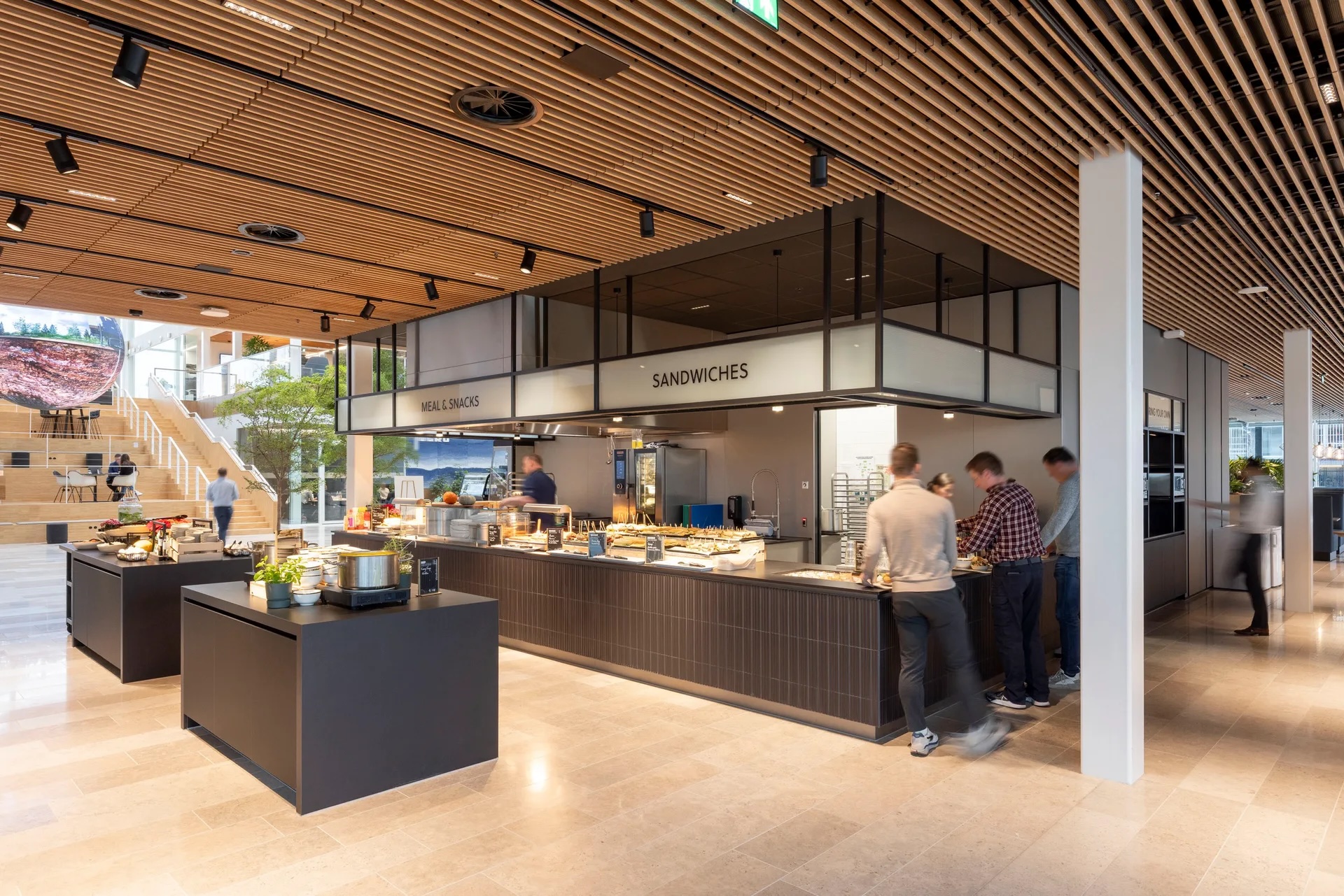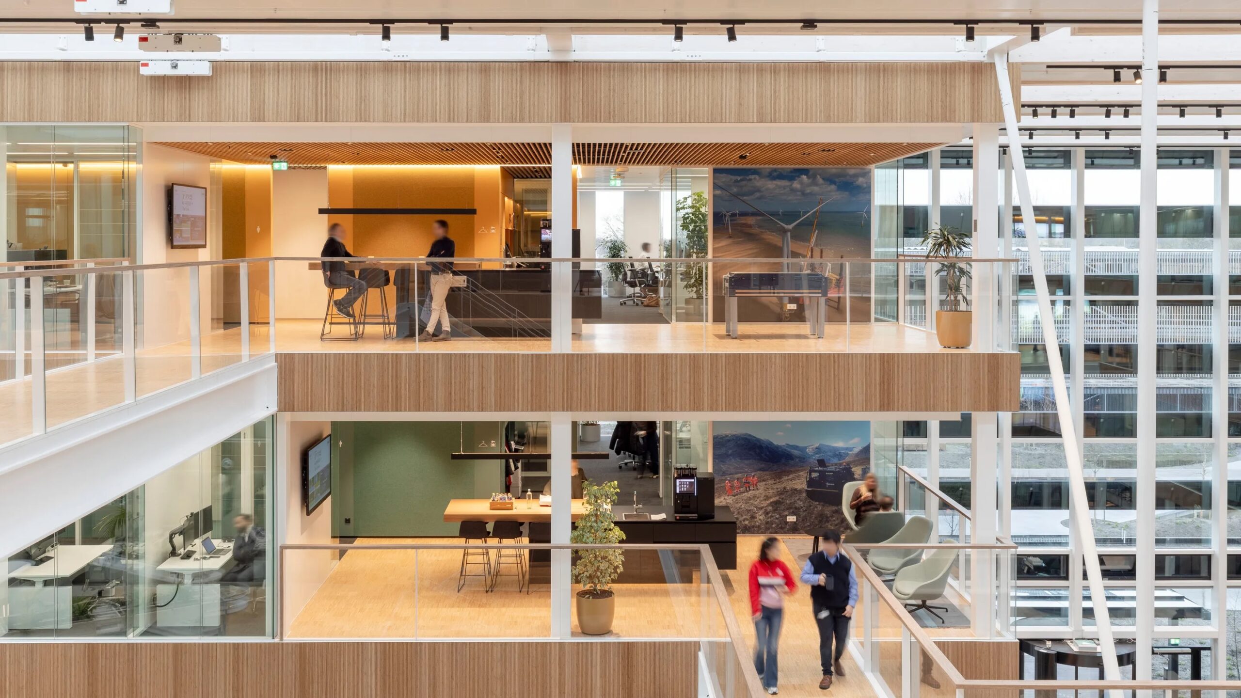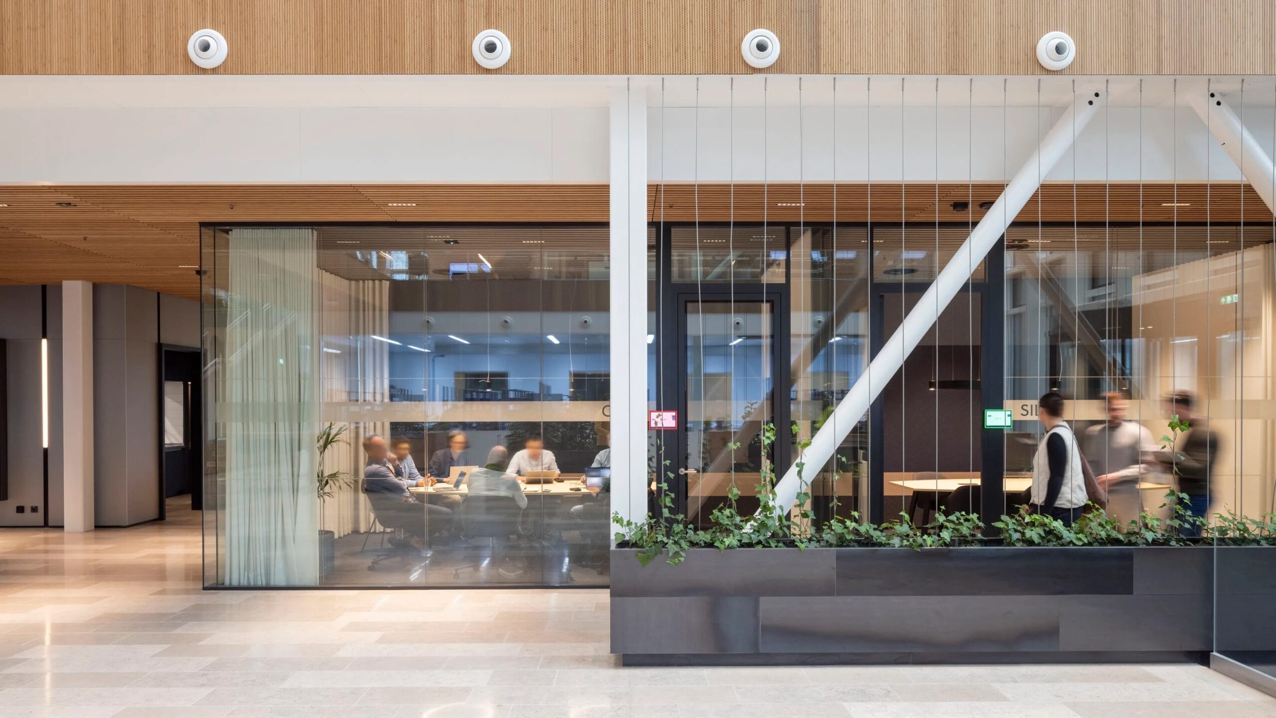 De landschappelijke tuin lijkt zich voort te zetten tot in het gebouw, want ook inpandig is de beplanting rijkelijk aanwezig. De connectie tussen de buiten- en binnenwereld is wederkerig. Dankzij het vele glas in de gevels is de tuin vanuit verschillende standpunten in het gebouw onbelemmerd te bezichtigen. Vanaf de twee daktuinen is het uitzicht zelfs panoramisch.