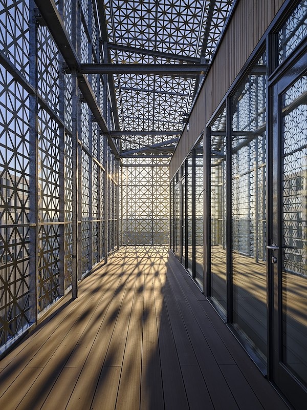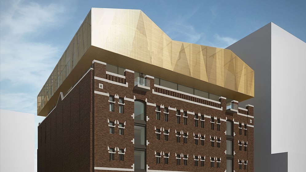 Rondom de opbouw is een semi-transparante huid gevouwen van geperforeerde, goudkleurige aluminiumplaat. Aan de onderzijde rust de huid op teruggelegen glasgevels, waardoor de nieuwe kroon boven het oude gebouw lijkt te zweven. Om de relatie met buiten te versterken, is de aluminium beplating doorgezet ín de optop, als afwerking rond de vide en de hoofdtrappartij.