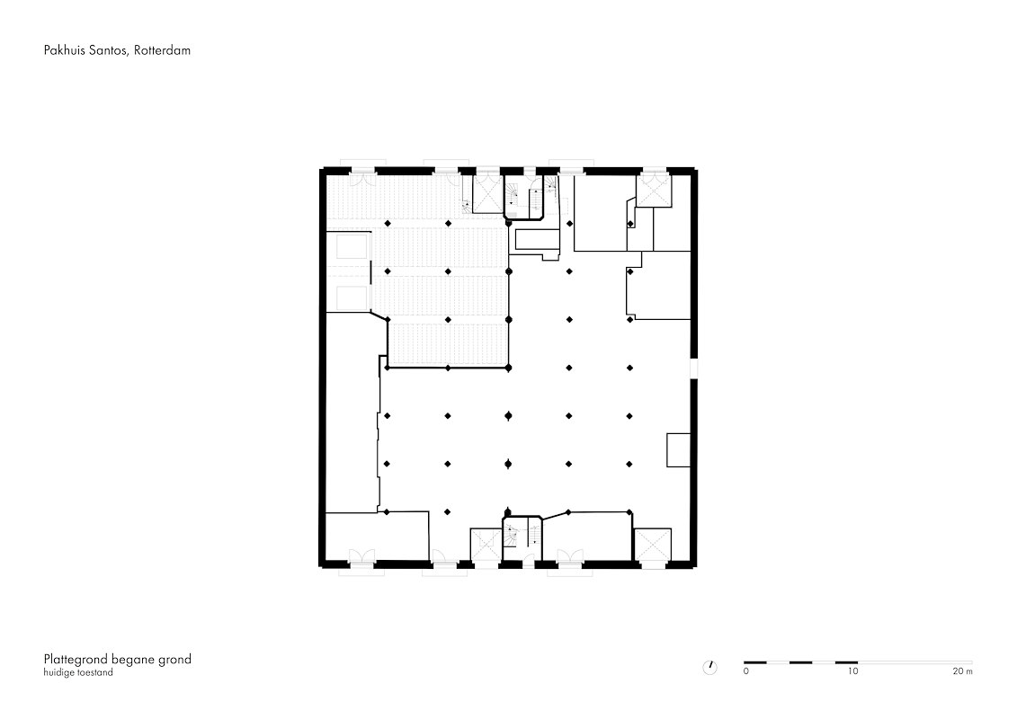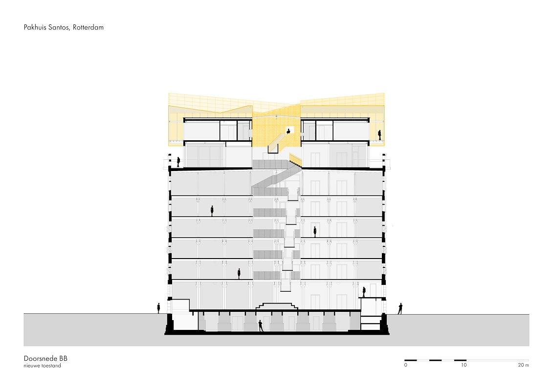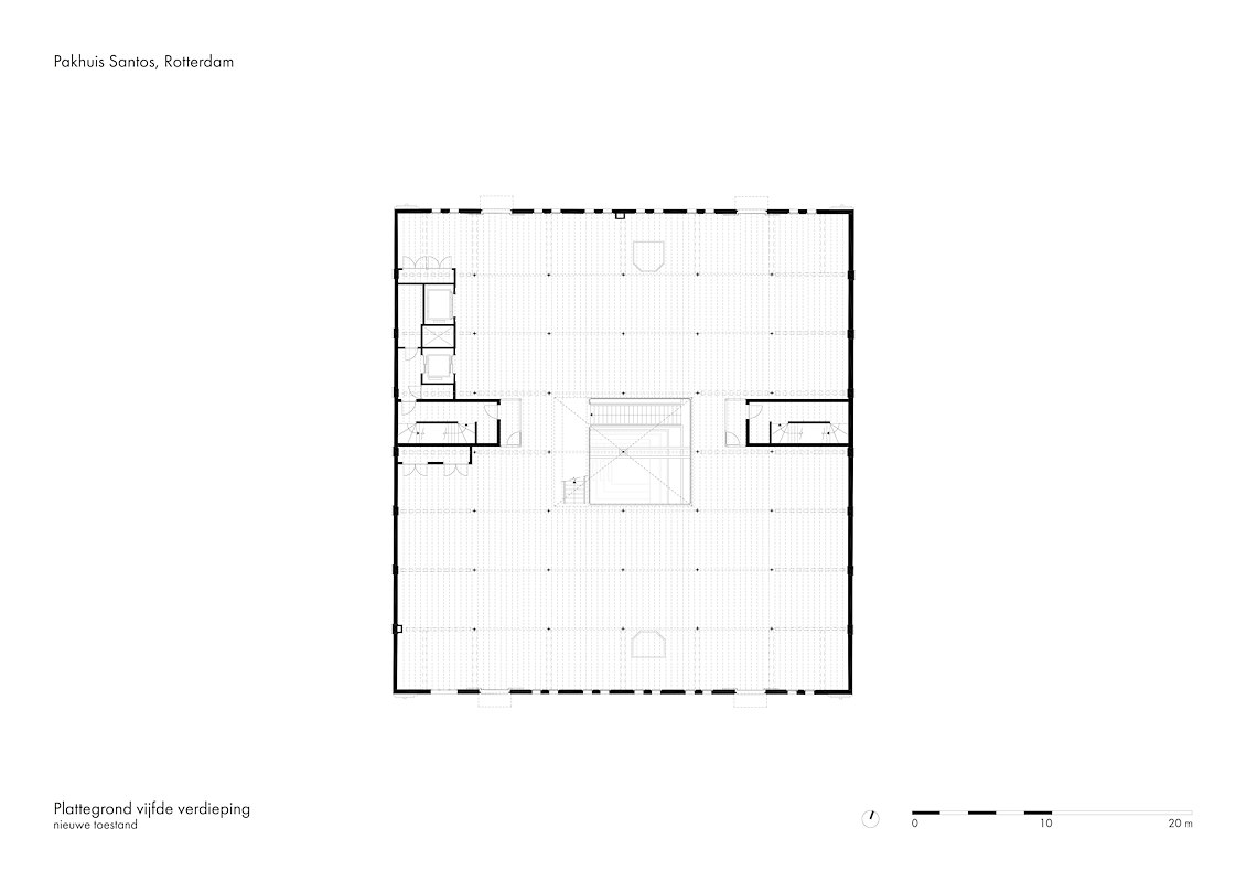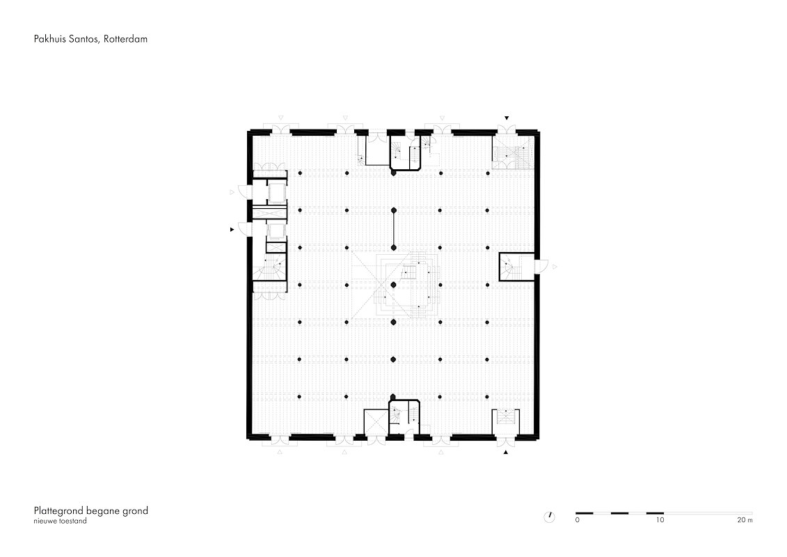 De originele trappenhuizen tegen de noord- en zuidgevel zijn niet meer in bedrijf, maar wel blijven staan vanwege de monumentenstatus van Santos. In de ontsluiting is nu voorzien via liften en een ensemble van stalen trappen in de centrale vide, oplopend van de begane-grondvloer tot in de tweelaagse optop op het oorspronkelijke dak.