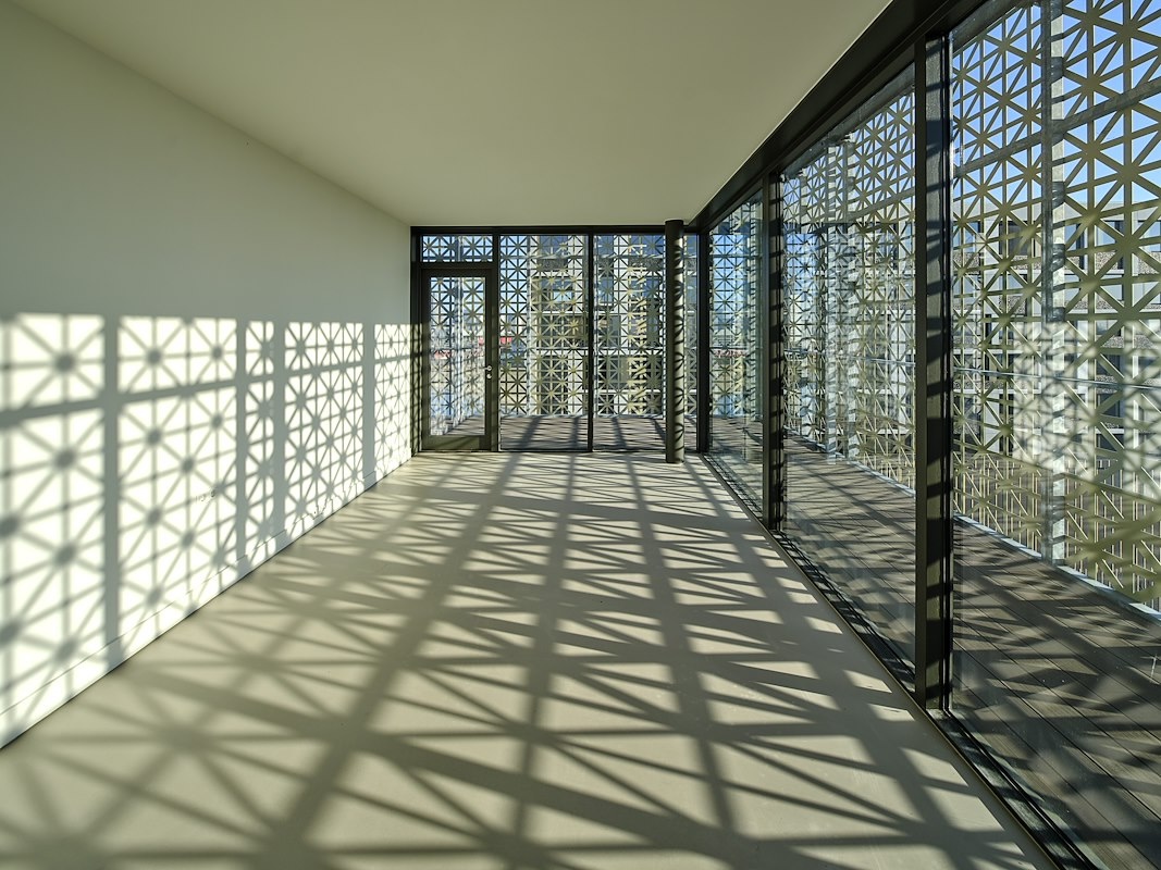 Deze nieuwe opbouw staat welhaast in ultiem contrast met de bestaande onderbouw: transparante lichtheid versus massieve stevigheid. De toevoeging is vormgeven als een sculpturale kroon met een ongelijkmatig sheddak. Het dak is volledig beglaasd waardoor het daglicht tot diep in de open ruimte kan doordringen.
