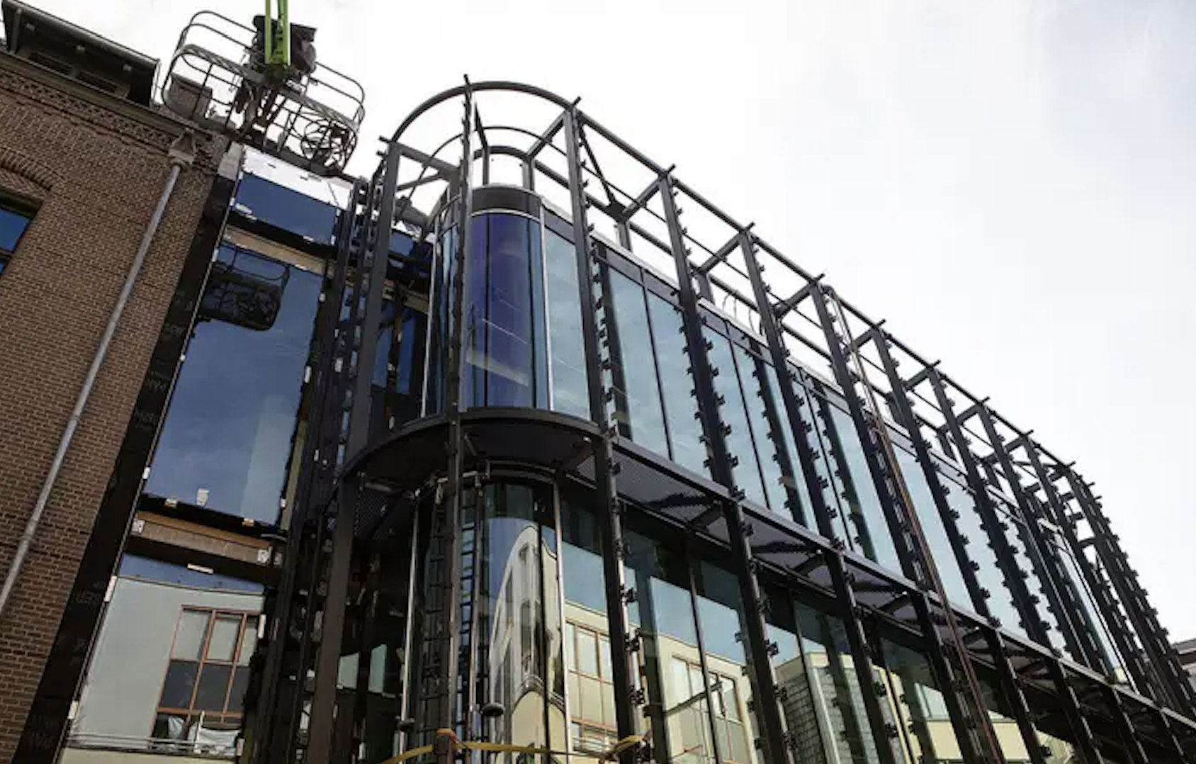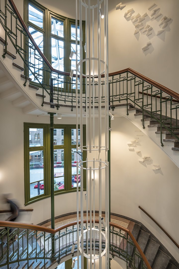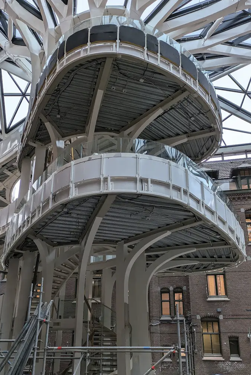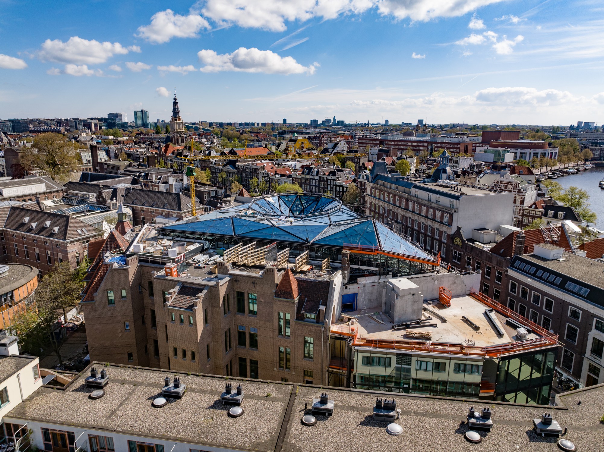 De beide voormalige zorggebouwen, in 1897 ontworpen door architect Frans Poggenbeek, waren al vanaf begin jaren ’80 in gebruik door UvA. Maar sinds september 2025 zijn de twee monumenten weer helemaal toekomstbestendig dankzij een discrete restauratie en renovatie, naar ontwerp van architectenbureau J. van Stigt. Van de tekentafel van MVSA Architects komen de nieuwe toevoegingen aan het gebouwen-ensemble, met als kers op de taart een spectaculaire stalen boomstructuur met lift, trap en uitkijk- annex studiebordessen.