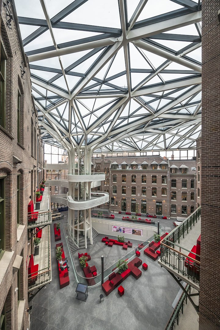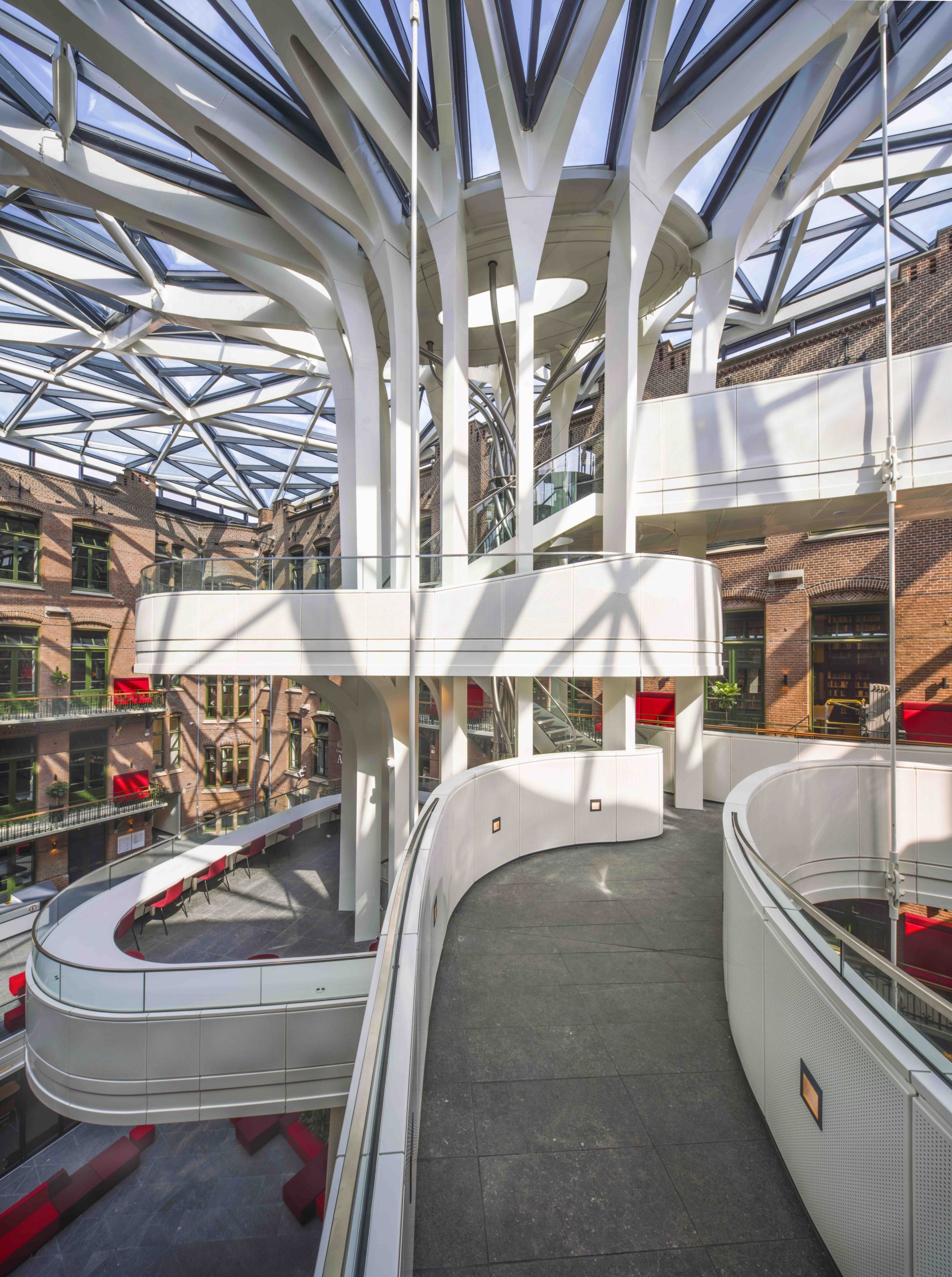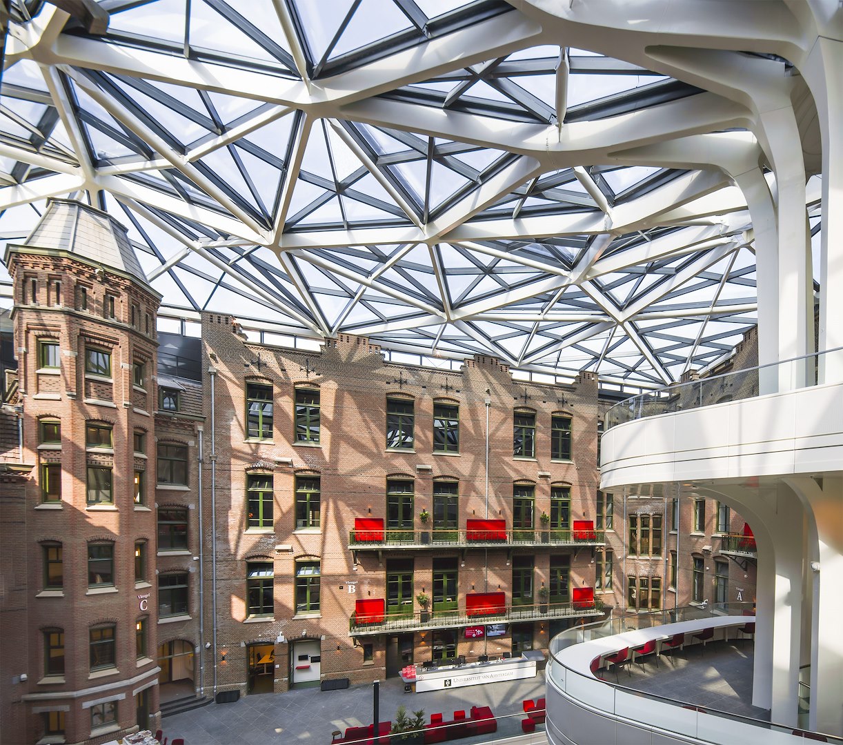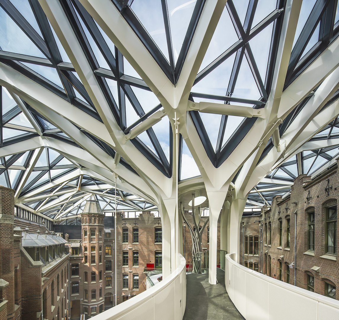 De gebouwen-verzameling wordt een samenhangend ensemble dankzij de overkapping van de gemeenschappelijke binnentuin. Midden in de tuin is een 20 m. hoge stalen ‘boom’ geplant, met stalen takken en glazen bladeren die zich uitstrekken over het terrein en het aangrenzende deel van de bebouwing. De complexe constructie is opgebouwd uit kokers met daartussen rechte staven. De knooppunten, 55 in getal, zijn 3D-gevormd en na montage afgedekt met stalen sierkappen die de knopen de gewenste geronde, vloeiende verschijningsvorm verlenen.