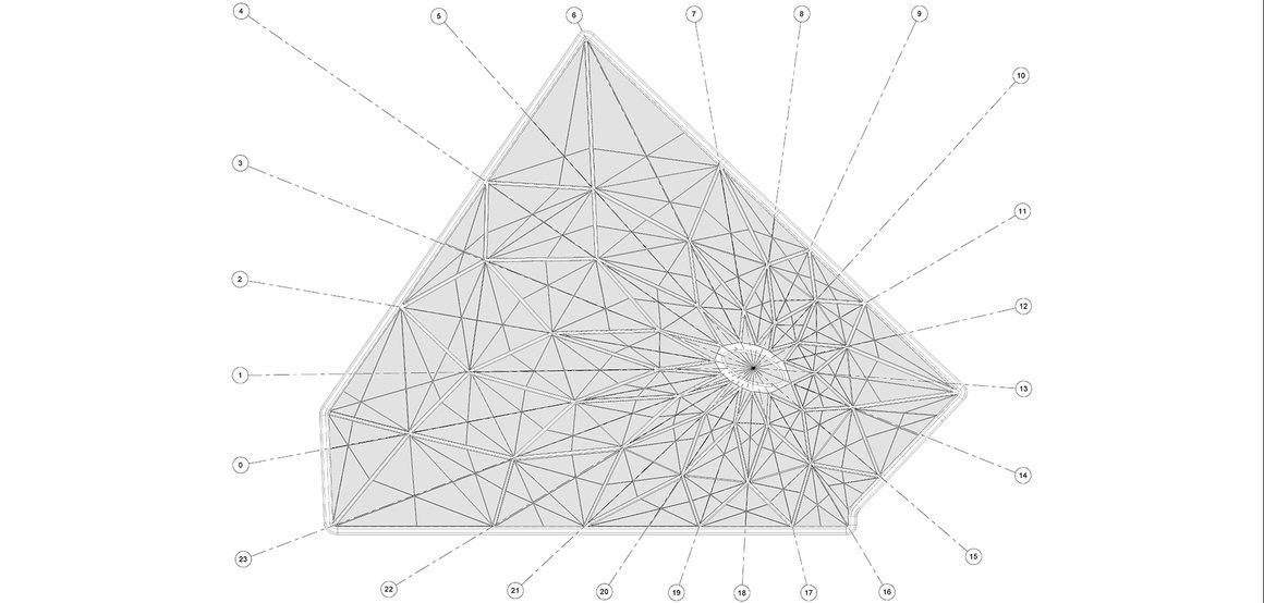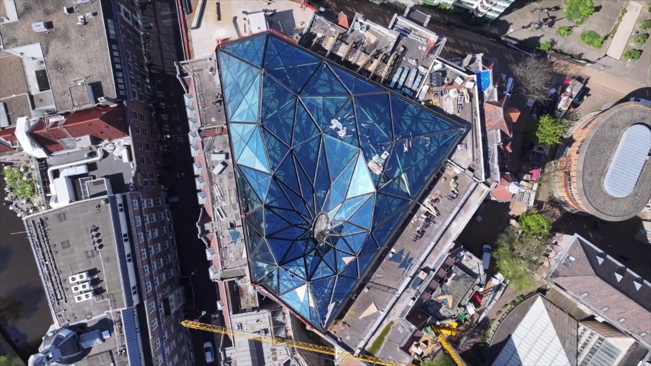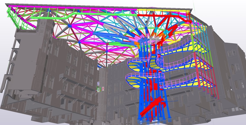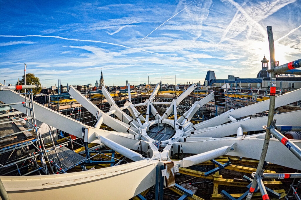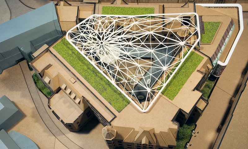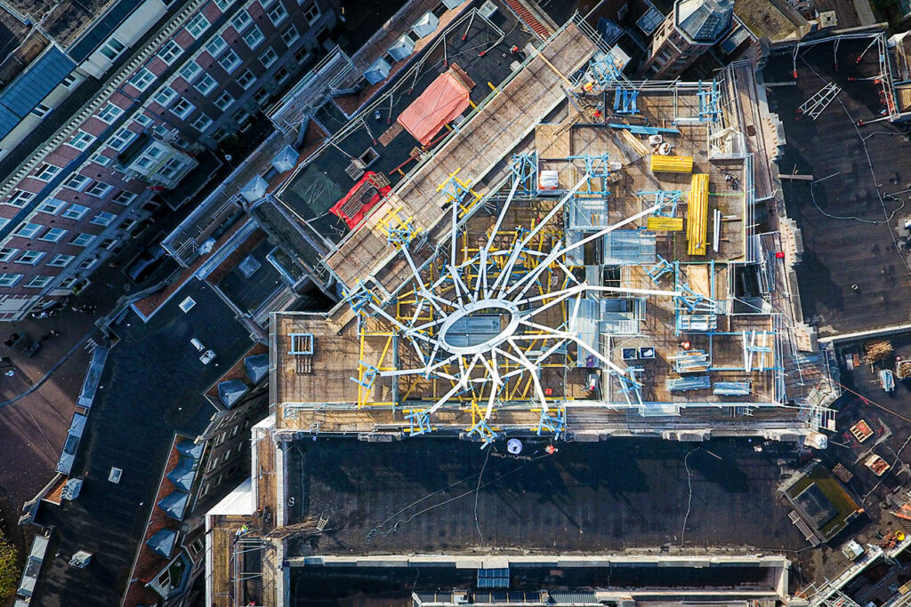 De gebouwen-verzameling wordt een samenhangend ensemble dankzij de overkapping van de gemeenschappelijke binnentuin. Midden in de tuin is een 20 m. hoge stalen ‘boom’ geplant, met stalen takken en glazen bladeren die zich uitstrekken over het terrein en het aangrenzende deel van de bebouwing. De complexe constructie is opgebouwd uit kokers met daartussen rechte staven. De knooppunten, 55 in getal, zijn 3D-gevormd en na montage afgedekt met stalen sierkappen die de knopen de gewenste geronde, vloeiende verschijningsvorm verlenen.