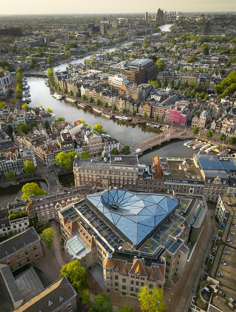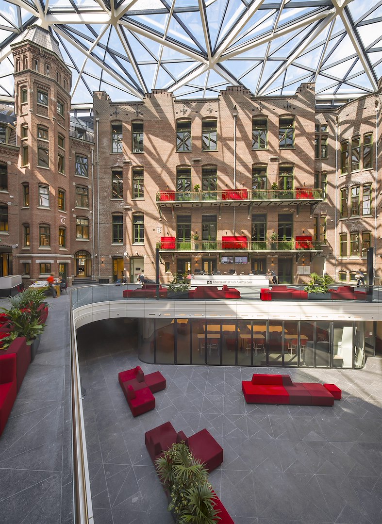 Bovendien promoveert het 1.200 m2 grote dak de binnentuin tot een atrium dat werkt als klimaatbuffer voor het gebouw en als kloppend hart van het bibliotheekcomplex en van de binnenstedelijke UvA-campus als geheel. Het atrium telt twee vloeren, een op maaiveldniveau en een verdiepte vloer. Gezamenlijk vormen ze het ontmoetingscentrum van het complex. De begane-grondvloer is tevens gereserveerd voor receptie- en service-balies. De ‘kelderverdieping’ biedt ook ruimte aan exposities, debatten en evenementen.