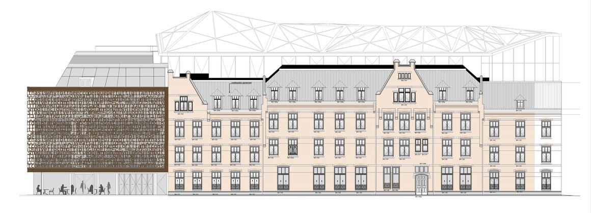 Het overall architectonisch ontwerp stoelt op het afgewogen renoveren van de bestaande panden en het respectvol toevoegen van de benodigde nieuwbouw zodat de eigenheid en historische en culturele waarden van de oudbouw, begin vorige eeuw gebouwd, behouden blijven. Veranderingen van het exterieur van de bestaande gebouwen blijft sowieso tot het minimum beperkt, want beide prijken op de monumentenlijst.