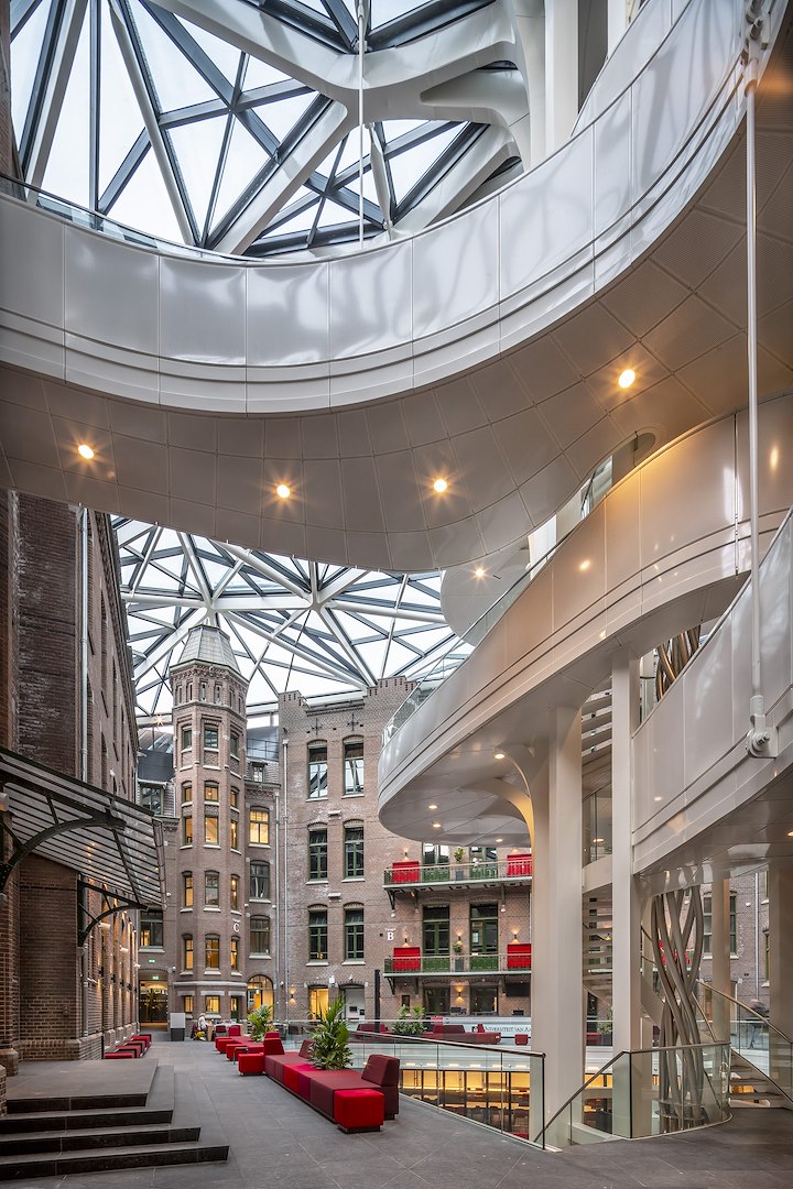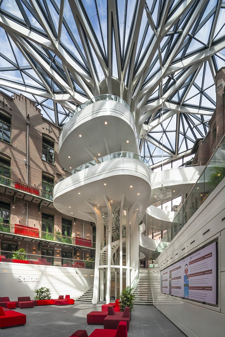 Zo brengt de boomstructuur met kap de bestaande gebouwen op een respectvolle manier bijeen voor hun nieuwe functie, zonder inbreuk te maken op het oorspronkelijke architectonisch beeld.