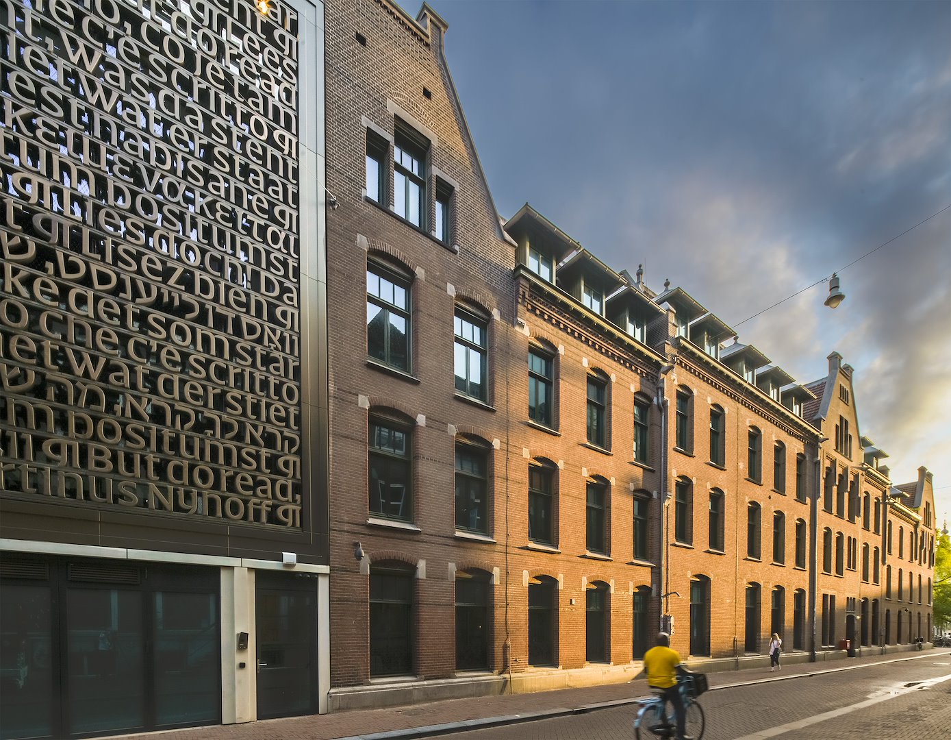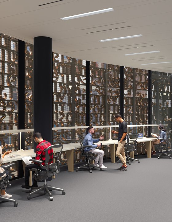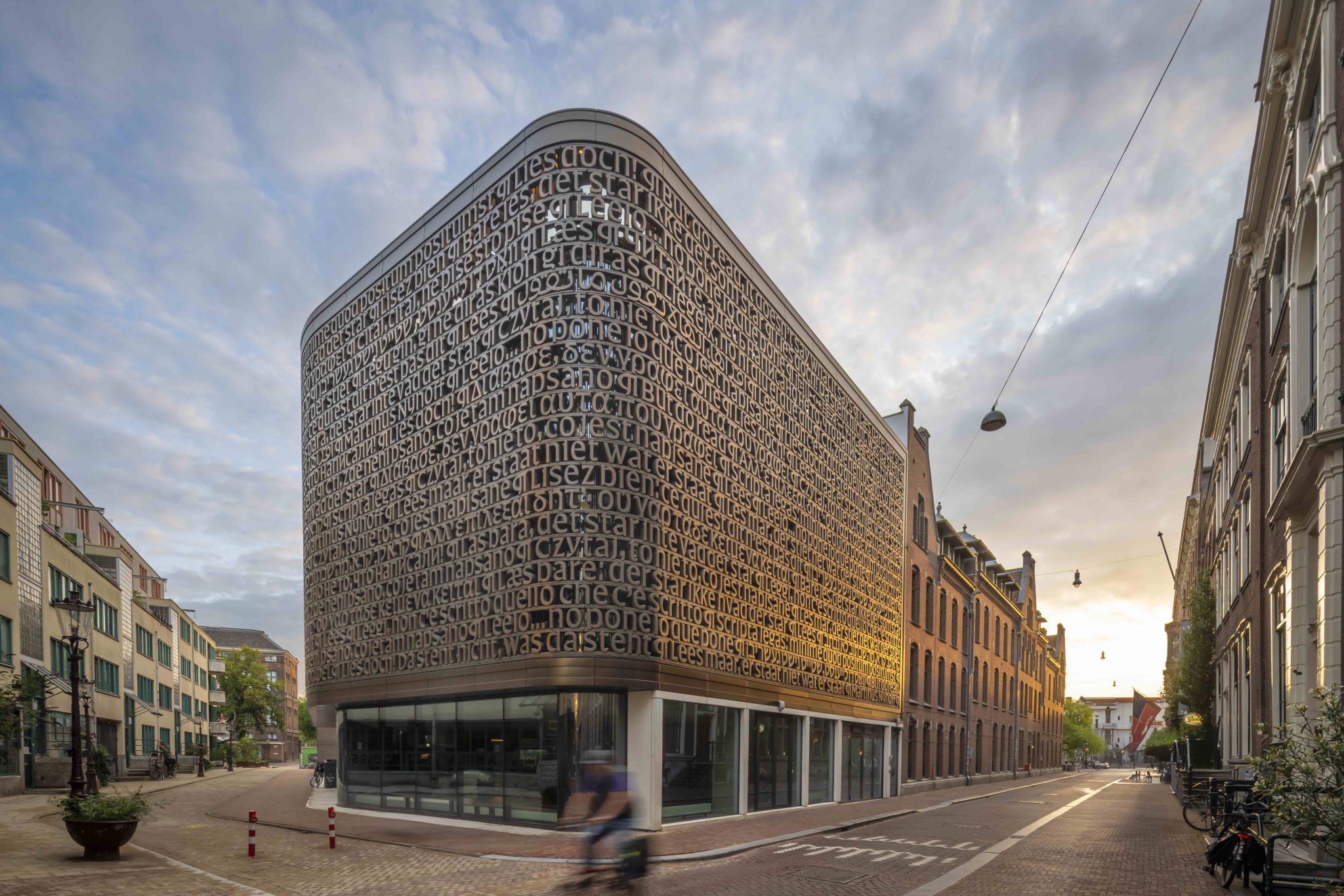 Aan de bestaande bouw is een nieuwbouwvleugel toegevoegd voor het studentencafé (op de begane grond) en lees- en (samen)werkruimten op de verdiepingen, letterlijk tussen de boeken, met gemakkelijk verplaatsbaar meubilair en audiovisuele voorzieningen. De nieuwbouw grenst aan het dakterras met uitkijk over de binnenstad. Rondom de verdiepingen is aan de buitenzijde een gevelscherm opgetrokken dat de daglichttoetreding tot de studieruimten tempert en voorkomt dat bibliotheekgebruikers en naburige bewoners bij elkaar in het boek kunnen kijken. Het 3D-geprinte, semi-transparante en bronskleurige scherm bevat de letters van een zin uit het gedicht ‘Awater’ van Martinus Nijhoff: ‘Lees maar, er staat niet wat er staat’. En dat staat er in 24 talen, alle talen waarin de UvA haar onderwijs aanbiedt.