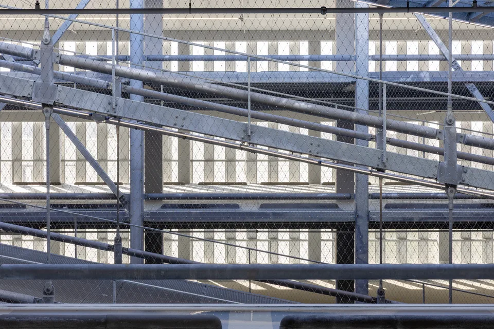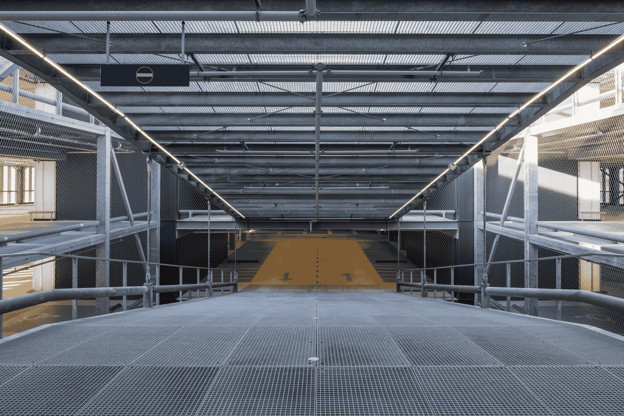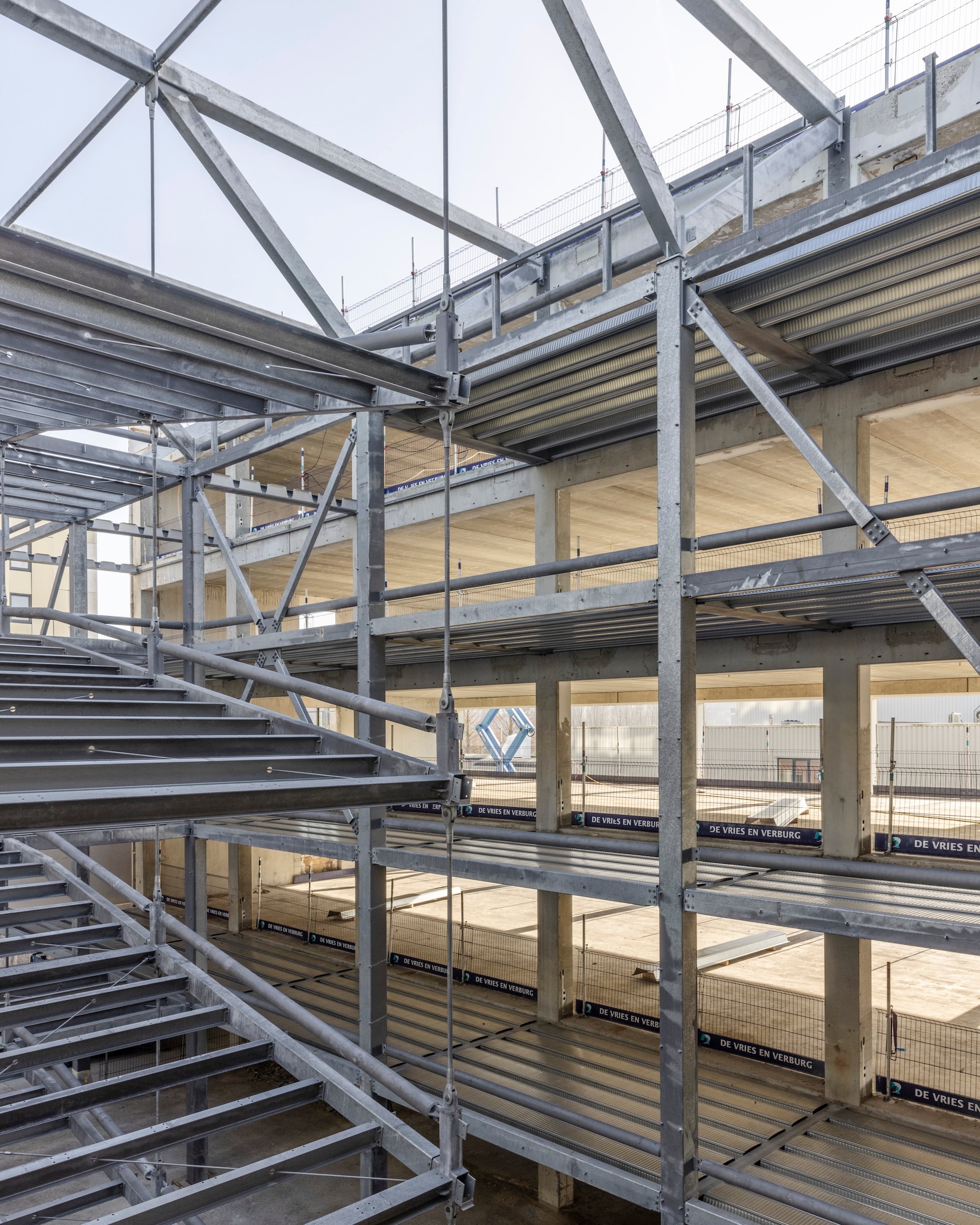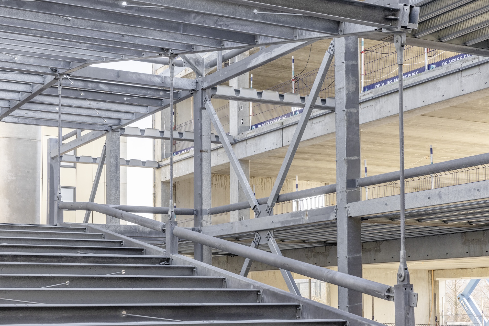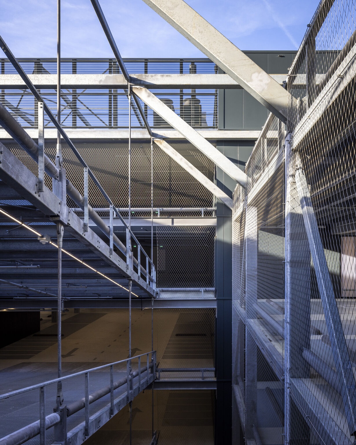 Midden in het gebouw, tussen het bestaande staalskelet en betonskelet, is een nieuwe staalconstructie ingevoegd met staalplaat-betonvloeren voor extra parkeerplaatsen en met stalen persroosters voor de hellingbanen en bordessen. Op de buitenste hoeken zijn twee nieuwbouwdelen van vier verdiepingen toegevoegd, beide vervat in een staalskelet met kanaalplaat- of staalplaat-betonvloeren. Zo is ’t gelukt om de gewenste 400 parkeerplaatsen en bijbehorende infrastructuur een plek te geven.