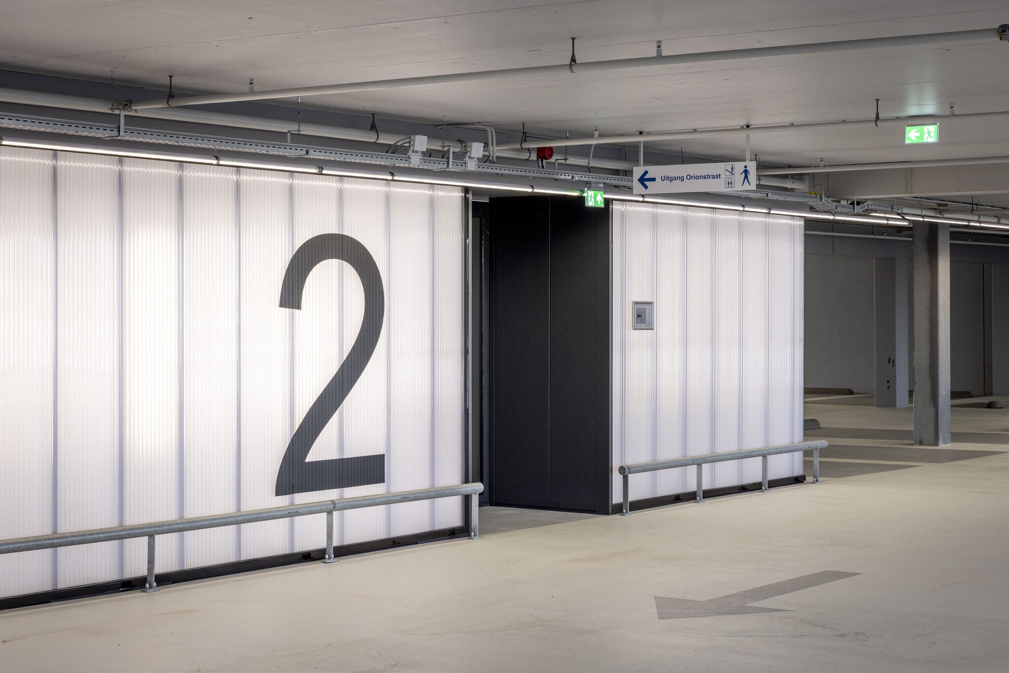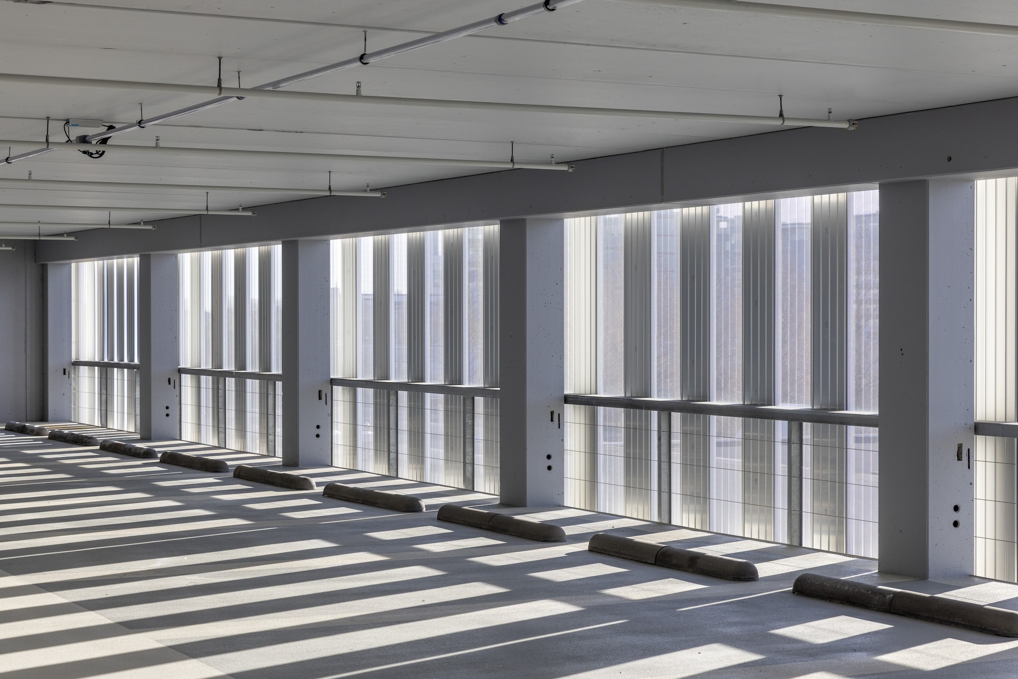 Boven de plint gaan de parkeerverdiepingen gehuld in aluminium felsplaten, in brede, verticale banen. De gevels hebben lichte tinten meegekregen, in contrast met de hoofdzakelijk donkere kleurstelling van de gevels eronder. Hierdoor lijkt ’t wel of de parkeerverdiepingen zweven boven de plint. De felsplaten zijn deels geperforeerd waardoor de garage natuurlijk kan worden geventileerd, er voldoende daglicht toetreedt en het zicht op de omgeving wordt gewaarborgd.
